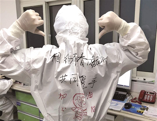 防護(hù)服上寫下暖心話語(市傳染病醫(yī)院提供)。