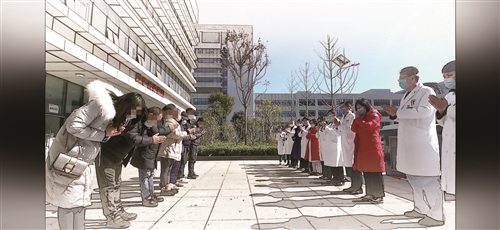 在徐醫(yī)附院東院,出院的患者向醫(yī)護(hù)人員鞠躬,表示敬意。