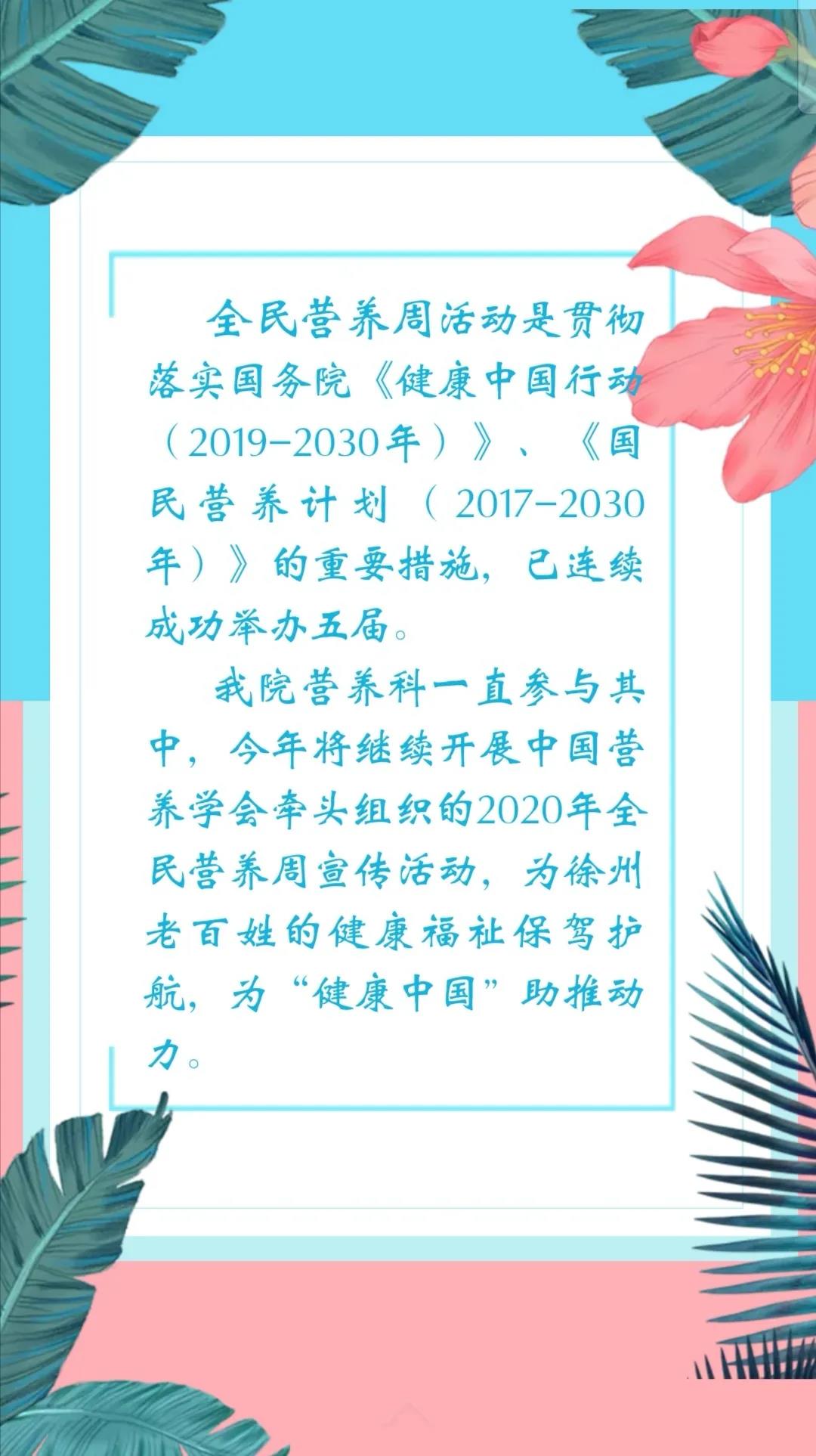 “合理膳食,免疫基石”,每天學(xué)習(xí)一些營(yíng)養(yǎng)知識(shí),每天進(jìn)步一點(diǎn)點(diǎn),為我們的身體保駕護(hù)航。歡迎各位朋友屆時(shí)參與徐州市一院臨床營(yíng)養(yǎng)科的活動(dòng)。