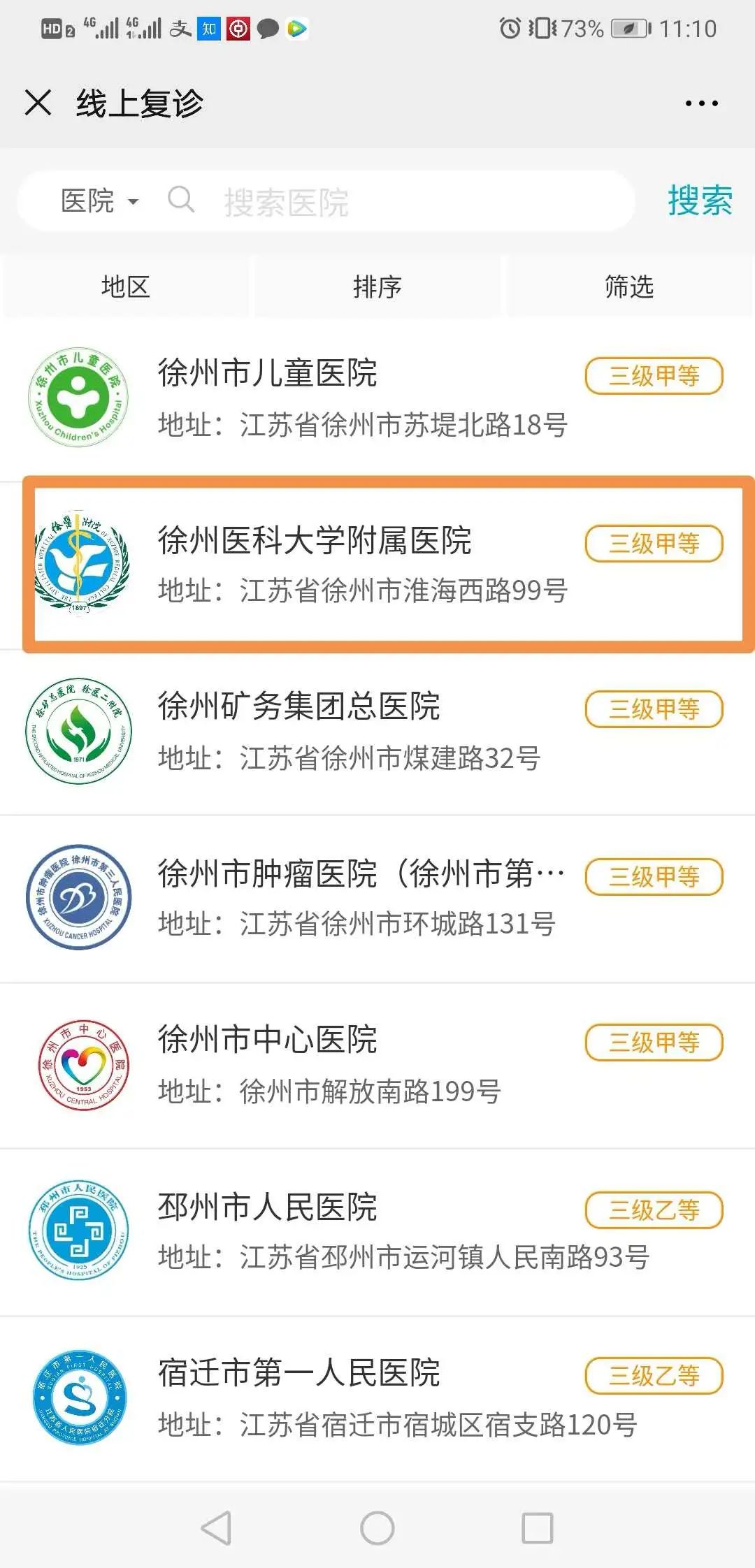 四、 選擇醫(yī)院  進(jìn)入公眾號—醫(yī)療服務(wù)—線上復(fù)診—徐州醫(yī)科大學(xué)附屬醫(yī)院