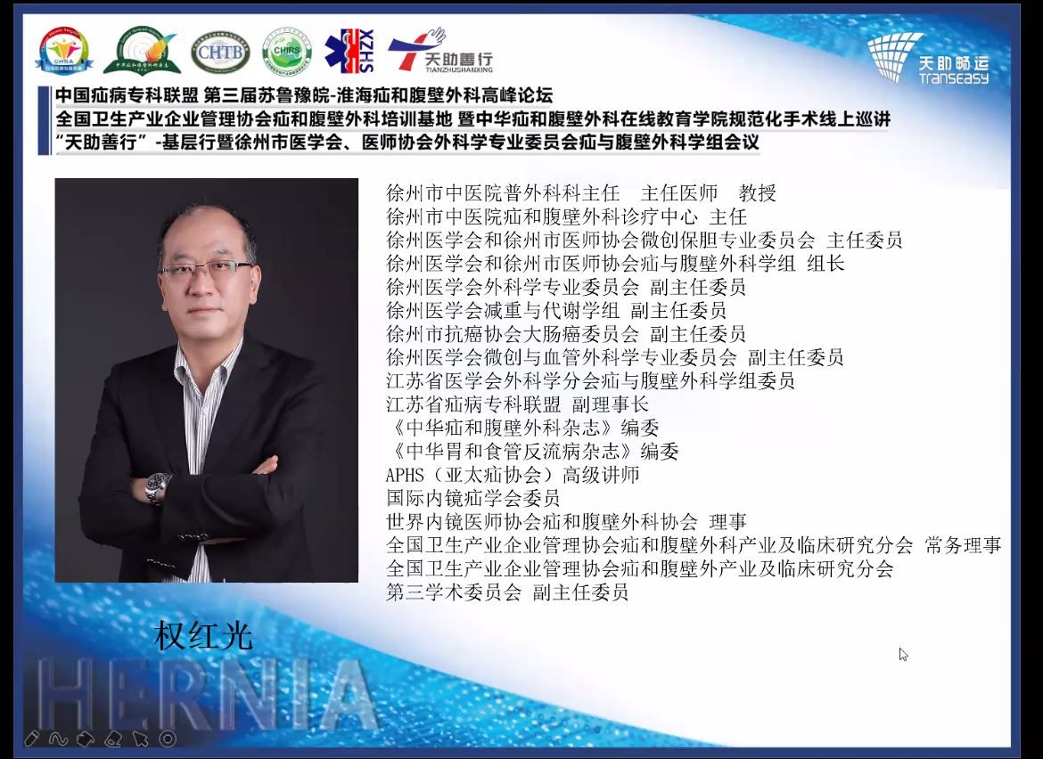 黃淮網(wǎng)  2020年6月27日,由全國(guó)衛(wèi)生產(chǎn)業(yè)企業(yè)管理協(xié)會(huì)疝和腹壁外科產(chǎn)業(yè)及臨床研究分會(huì)、中國(guó)疝病?坡(lián)盟-登記隨訪系統(tǒng)-疝病治療和研究中心、徐州市醫(yī)學(xué)會(huì)、醫(yī)師協(xié)會(huì)外科學(xué)專業(yè)委員會(huì)疝和腹壁外科學(xué)組主辦,徐州市中醫(yī)院承辦的中國(guó)疝病?坡(lián)盟 第三屆蘇魯豫皖-淮海疝和腹壁外科高峰論壇;全國(guó)衛(wèi)生產(chǎn)業(yè)企業(yè)管理協(xié)會(huì)疝和腹壁外科培訓(xùn)基地暨中華疝和腹壁外科在線教育學(xué)院規(guī)范化手術(shù)線上巡講;“天助疝行”-基層行暨徐州市醫(yī)學(xué)會(huì)、醫(yī)師協(xié)會(huì)外科學(xué)專業(yè)委員會(huì)疝和腹壁外科學(xué)組會(huì)議在線上順利召開(kāi)。雖然由于疫情的原因,與會(huì)專家與參會(huì)代表們不能在一起面對(duì)面的暢所欲言,但線上會(huì)的新穎形式依舊吸引了更多參會(huì)人們的熱情。
