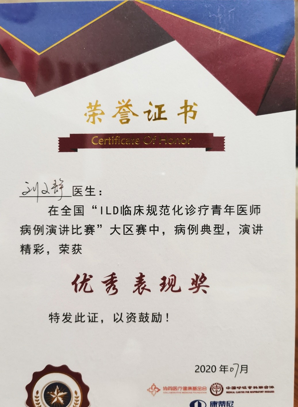徐醫(yī)附院呼吸與危重癥醫(yī)學(xué)科劉文靜醫(yī)生在全國“ILD臨床規(guī)范化診療青年醫(yī)師病例演講比賽”中榮獲優(yōu)秀表現(xiàn)獎