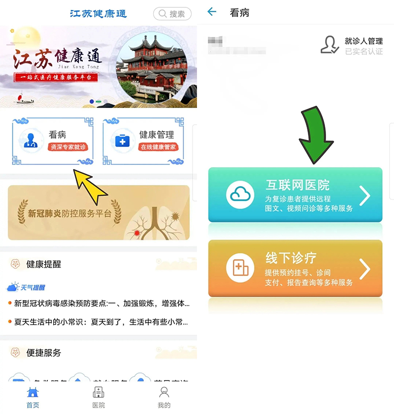 打開APP,進入“看病”欄目,點擊“互聯(lián)網(wǎng)醫(yī)院”