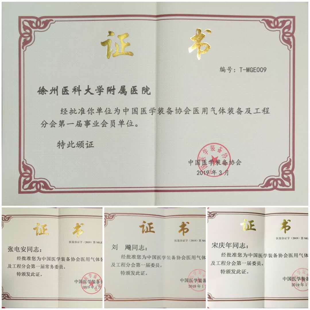 2019年1月,徐醫(yī)附院供氧中心積極加入中國(guó)醫(yī)學(xué)裝備協(xié)會(huì)醫(yī)用氣體裝備及工程分會(huì)、中國(guó)氣體協(xié)會(huì)醫(yī)用氣體及工程分會(huì)。分會(huì)根據(jù)徐醫(yī)附院供氧中心取得的成績(jī)明確我院為徐州市唯一的會(huì)員單位,病房管理科張電安科長(zhǎng)當(dāng)選為中國(guó)醫(yī)學(xué)裝備協(xié)會(huì)醫(yī)用氣體裝備及工程分會(huì)、中國(guó)氣體協(xié)會(huì)醫(yī)用氣體及工程分會(huì)第一屆常務(wù)委員,劉飚班長(zhǎng)、宋慶年同志當(dāng)選為委員。