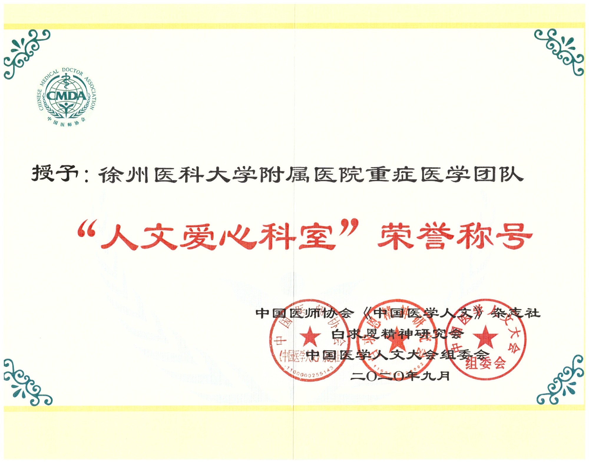 黃淮網(wǎng) 9月27日,由中國(guó)醫(yī)師協(xié)會(huì)、白求恩精神研究會(huì)、中國(guó)醫(yī)師協(xié)會(huì)人文醫(yī)學(xué)專業(yè)委員會(huì)、《中國(guó)醫(yī)學(xué)人文》雜志社聯(lián)合主辦的第四屆中國(guó)醫(yī)學(xué)人文大會(huì)在北京隆重召開(kāi)。本次大會(huì)以“生命至上——人文精神與抗疫”為主題,會(huì)上通報(bào)表彰了榮獲全國(guó)“人文愛(ài)心醫(yī)院”、“人文愛(ài)心科室”、第四屆“白求恩式好醫(yī)生”、“白求恩式好醫(yī)生提名獎(jiǎng)”的先進(jìn)集體和個(gè)人。經(jīng)過(guò)層層選拔評(píng)審,徐州醫(yī)科大學(xué)附屬醫(yī)院重癥醫(yī)學(xué)團(tuán)隊(duì)獲“人文愛(ài)心科室”榮譽(yù)稱號(hào)、重癥醫(yī)學(xué)科副主任醫(yī)師晁亞麗獲全國(guó)第四屆“白求恩式好醫(yī)生”榮譽(yù)稱號(hào)。