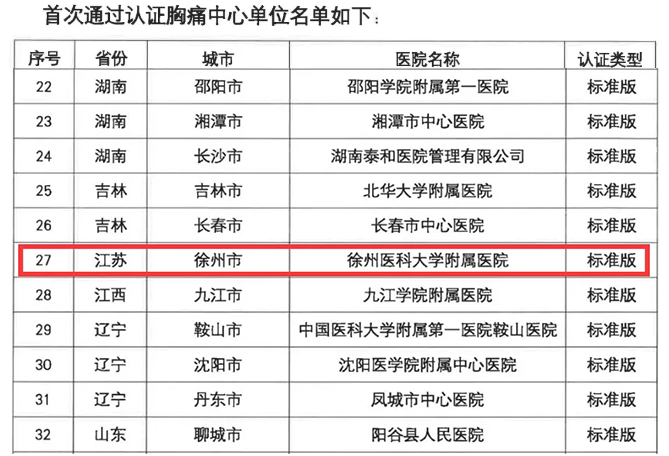 2020年11月16日,中國(guó)胸痛中心聯(lián)盟發(fā)布《關(guān)于2020年度第二批次中國(guó)胸痛中心及中國(guó)基層胸痛中心通過認(rèn)證單位公告》,徐州醫(yī)科大學(xué)附屬醫(yī)院胸痛中心以高分通過中國(guó)胸痛中心(標(biāo)準(zhǔn)版)的認(rèn)證。此次認(rèn)證的順利通過標(biāo)志著徐醫(yī)附院胸痛中心建設(shè)邁進(jìn)了新的階段,也代表著徐醫(yī)附院胸痛中心高質(zhì)量建設(shè)成果得到了國(guó)家級(jí)的認(rèn)證。