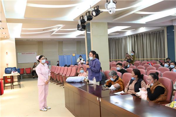 隨后,王妍妍護(hù)士長帶來了《早產(chǎn)兒的喂養(yǎng)及追趕性生長》,陳丹護(hù)士帶著寶爸、寶媽手把手進(jìn)行了早產(chǎn)兒撫觸及被動操的教學(xué)。在問答環(huán)節(jié)和抽獎環(huán)節(jié),家長們熱情參與,更是將現(xiàn)場氣氛推向高潮。