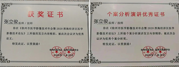 其中,孫存杰主任帶領(lǐng)徐州地區(qū)參會(huì)的影像技術(shù)人員宣讀影像技術(shù)專業(yè)誓詞,孫存杰主任和張立俊主任分別做了精彩的大會(huì)發(fā)言。孫存杰主任技師榮獲專家優(yōu)秀獎(jiǎng),張立俊副主任技師榮獲優(yōu)秀論文獎(jiǎng)。同時(shí),張老師在會(huì)上所做的個(gè)案分析演講發(fā)言內(nèi)容精彩,被此次大會(huì)評(píng)為“優(yōu)秀個(gè)案分析獎(jiǎng)”。
