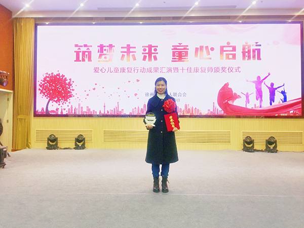 黃淮網(wǎng) 12月10日,徐州市“筑夢未來 童心啟航”愛心兒童康復(fù)行動(dòng)成果匯演暨十佳康復(fù)治療師頒獎(jiǎng)儀式在市殘疾人康復(fù)中心舉行,F(xiàn)場為徐州市十佳康復(fù)治療師獲得者頒獎(jiǎng)。徐州醫(yī)科大學(xué)附屬醫(yī)院董海菊被授予徐州市“十佳康復(fù)治療師”榮譽(yù)稱號。