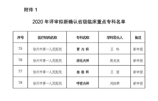 黃淮網(wǎng)  近日,江蘇省衛(wèi)健委發(fā)文公布2020年省級臨床重點?圃u審與驗收結(jié)果。徐州市第一人民醫(yī)院腎內(nèi)科、消化內(nèi)科、檢驗科、呼吸內(nèi)科四個專科被評定為省級臨床重點?啤
