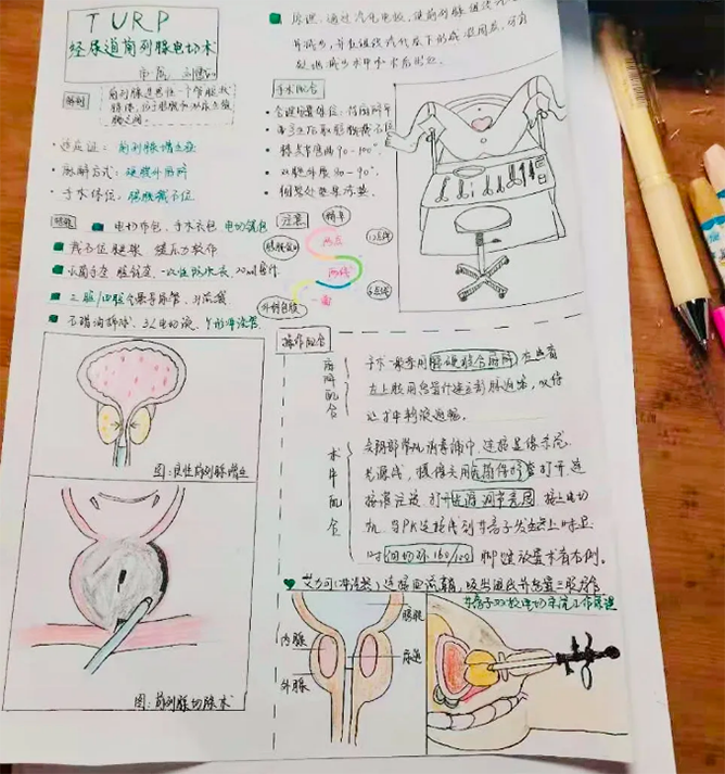 二等獎獲得者、手術(shù)室4年護士劉雯麗把自己的筆記分為兩種,一種是隨身攜帶偏向于術(shù)者習慣的文字記錄,筆記中的圖很多是她在空暇時,請術(shù)者給她畫的幾筆草圖,她認為這樣更容易從術(shù)者的思路熟悉手術(shù)。另一種是本次參賽圖,名為“TURP經(jīng)尿道前列腺電切術(shù)”。“我認為,優(yōu)秀的洗手護士要具有團結(jié)、高效、低耗的作用。”劉雯麗稱。