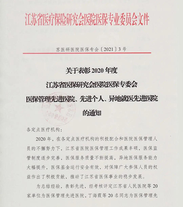 黃淮網(wǎng)(劉波)4月19日,江蘇省醫(yī)療保險研究會醫(yī)院醫(yī)保專業(yè)委員會印發(fā)了《關(guān)于表彰2020年度江蘇省醫(yī)保研究會醫(yī)院醫(yī)保專委會醫(yī)保管理先進醫(yī)院、先進個人、異地就醫(yī)先進醫(yī)院的通知》。據(jù)文件內(nèi)容顯示,全省共有20家醫(yī)院獲得“2020年度江蘇省醫(yī)保管理先進醫(yī)院”榮譽稱號,其中,徐州有2家醫(yī)院登榜,徐州市婦幼保健院位列其中。