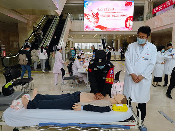 5月13日上午9點(diǎn),護(hù)理科普義診活動(dòng)在徐醫(yī)附院本部12號(hào)樓1層大廳及東院區(qū)門診大廳同時(shí)進(jìn)行,70余位護(hù)理管理者及專科護(hù)士參加組成護(hù)理專家義診團(tuán)隊(duì),通過(guò)示范心肺復(fù)蘇、海姆立克急救法、表演健腦手指操、發(fā)放宣傳資料等多種形式宣傳科普知識(shí)。