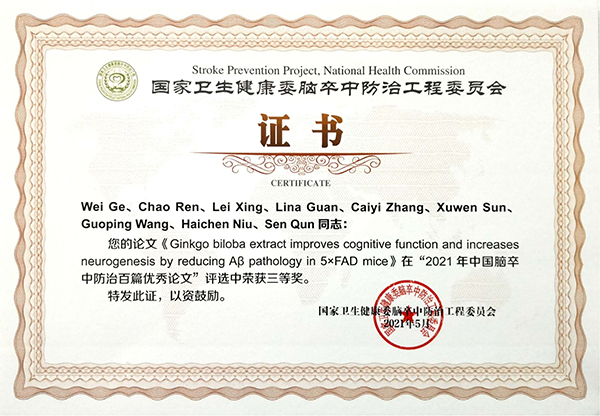 會上,腦防委對十年來在腦卒中防治工作中表現(xiàn)突出的醫(yī)療機構(gòu)管理者和優(yōu)秀專家進行表彰,徐醫(yī)附院腦卒中防治工作得到腦防委的肯定,再次被授予“高級卒中中心”;金培生常務(wù)副院長榮獲全國卒中防治“杰出擔(dān)當(dāng)獎”;耿德勤教授受聘為“國家互聯(lián)網(wǎng)+移動卒中救治聯(lián)盟委員”;醫(yī)務(wù)處王潔副處長榮獲“菁英先鋒獎”;神經(jīng)內(nèi)科葛巍(通訊作者)的論文《Ginkgo biloba extract improves cognitive function and increases neurogenesis by reducing Aβ pathology in 5×FAD mice 》榮獲“2021年度中國腦卒中防治百篇優(yōu)秀論文”三等獎。