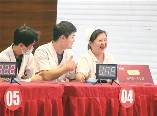 本次活動(dòng)共設(shè)置了3個(gè)答題環(huán)節(jié):團(tuán)隊(duì)必答題、搶答題、互動(dòng)題。團(tuán)隊(duì)必答題環(huán)節(jié),面對(duì)主持人拋出的問(wèn)題,各代表選手都能迅速作答,比分沒(méi)有拉開(kāi)差距。搶答環(huán)節(jié)最是激動(dòng)人心,除了要保證答題的準(zhǔn)確率,更是比拼“手速”的時(shí)刻,慢一點(diǎn)搶不到,太快了又會(huì)犯規(guī)而失去答題機(jī)會(huì)。選手們因?yàn)榍髣傩那,出現(xiàn)了好幾次集體搶答犯規(guī),引發(fā)全場(chǎng)一片歡笑聲。最終,經(jīng)過(guò)激烈角逐,內(nèi)科第一黨支部以300分摘得一等獎(jiǎng)。