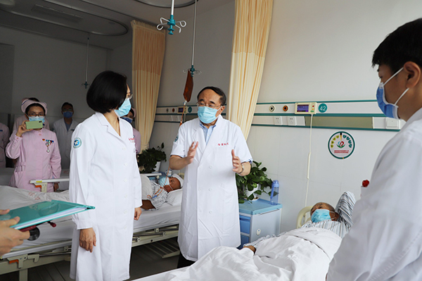 其后,在章龍珍主任、姚元虎主任等專家的陪同下,于金明院士走進(jìn)病房,來(lái)到患者身邊,和放療科醫(yī)護(hù)人員一齊分析患者病情、討論治療方案,為患者檢查身體、詢問(wèn)病情,耐心回答患者及家屬提出的問(wèn)題,還為患者做了心理疏導(dǎo)及健康指導(dǎo)。