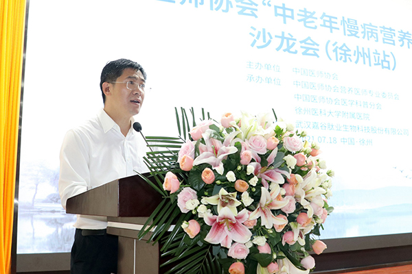 黃淮網(wǎng)  為踐行健康中國(guó)行動(dòng),讓更多更權(quán)威的營(yíng)養(yǎng)健康知識(shí)惠及大眾。7月18日上午,“中國(guó)醫(yī)師協(xié)會(huì)中老年慢病營(yíng)養(yǎng)健康科普”沙龍會(huì)(徐州站)在徐州醫(yī)科大學(xué)附屬醫(yī)院舉辦。徐州醫(yī)科大學(xué)黨委常委、副校長(zhǎng)、徐州醫(yī)科大學(xué)附屬醫(yī)院黨委書記王人顥;中國(guó)醫(yī)師協(xié)會(huì)副秘書長(zhǎng)郭海鵬;中國(guó)醫(yī)師協(xié)會(huì)鄉(xiāng)村醫(yī)生分會(huì)會(huì)長(zhǎng)鞏西啟;中國(guó)醫(yī)師協(xié)會(huì)鄉(xiāng)村醫(yī)生分會(huì)副會(huì)長(zhǎng)牛其厚;中國(guó)醫(yī)師協(xié)會(huì)辦公室主任韓峰;上海市第六人民醫(yī)院營(yíng)養(yǎng)科主任葛聲;北京積水潭醫(yī)院營(yíng)養(yǎng)科主任趙霞;徐州醫(yī)科大學(xué)附屬醫(yī)院營(yíng)養(yǎng)科主任孟暉;武漢嘉谷肽業(yè)生物科技股份有限公司總經(jīng)理李文濤等出席會(huì)議。徐州多家醫(yī)院的專家、基層醫(yī)師代表、社會(huì)群眾和新聞媒體的朋友等參加會(huì)議。徐州醫(yī)科大學(xué)技術(shù)學(xué)院副院長(zhǎng)、徐州醫(yī)科大學(xué)附屬醫(yī)院胃腸外科副主任邵永主持。