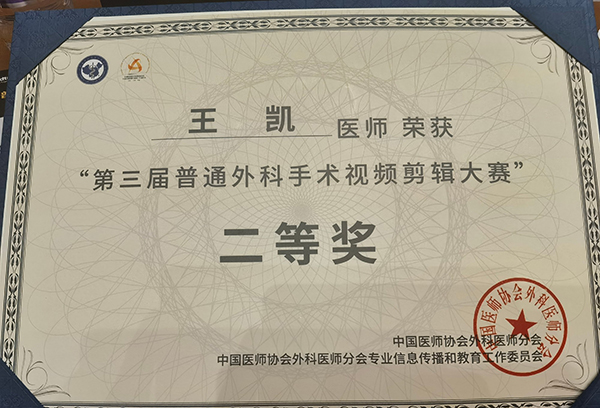 徐醫(yī)附院胃腸外科王凱博士榮獲第三屆全國普通外科視頻剪輯大賽二等獎