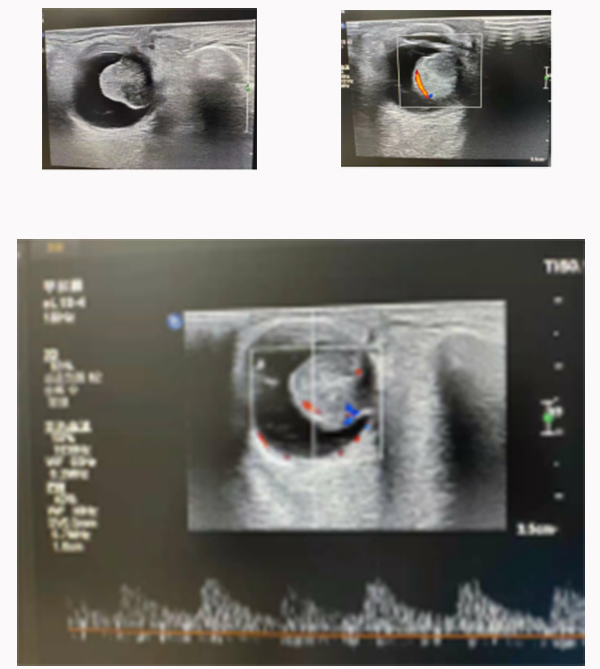 上圖是1例脈絡膜黑色素瘤患者,彩超檢查:可探及球內隆起實性病變,邊界清晰,內回聲不均勻為中低回聲,挖空征(+)。CDFI:玻璃體內病變中可探及較豐富的血流信號,脈沖多普勒為動脈型血流頻譜