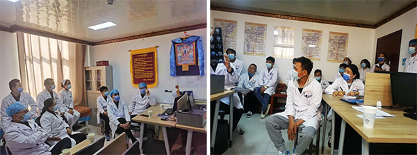 一位73歲的男性患者,主訴“反復(fù)腰背部疼痛2年余,加重3月”,曾經(jīng)輾轉(zhuǎn)數(shù)家醫(yī)院,一直未予明確診斷,應(yīng)用藏醫(yī)藥浴、NSAIDS類藥物及中醫(yī)中藥等治療均效果不明顯。查體,胸背部后凸畸形、指地距20cm、枕墻距10cm,雙側(cè)“4”字試驗(yàn)因不能平躺無法完成;多次檢查ESR、CRP均正常,腰椎、胸椎正側(cè)位片示:骨質(zhì)增生、部分椎體竹節(jié)樣改變,骶髂關(guān)節(jié)CT示:退行性變,關(guān)節(jié)面無明顯鋸齒狀改變。醫(yī)療隊(duì)根據(jù)患者情況組織了一次疑難病例討論,在醫(yī)療隊(duì)專家的啟發(fā)下,當(dāng)?shù)蒯t(yī)生踴躍發(fā)言,提出各自見解,氣氛非常熱烈。最后專家一致意見認(rèn)為這名患者應(yīng)該診斷為彌漫性特發(fā)性骨肥厚(DISH)綜合征,是一種少見病,并提出了中西藏醫(yī)結(jié)合的治療方案。討論結(jié)束后根據(jù)大家關(guān)注的問題,顧向浩和時(shí)超兩位主任又做了關(guān)節(jié)痛、腰痛診斷和鑒別診斷方面的講座,受到了當(dāng)?shù)蒯t(yī)生的歡迎。