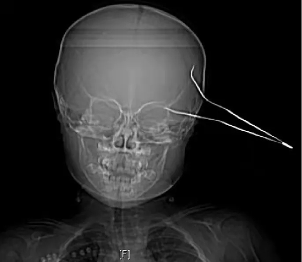 患兒笑笑(化名)是一位天真活潑,率真可愛的女孩,在父母的呵護下快樂成長。然而,天有不測風云, 10月23日中午10時許,笑笑在玩鬧過程中不慎摔傷,致15cm長的金屬鑷子刺入頭部,當時傷口少量出血,笑笑因疼痛哭鬧不止,家人將笑笑緊急送至當?shù)蒯t(yī)院,頭顱CT示左側(cè)顳部條狀致密影穿透左側(cè)顳骨,深入左側(cè)顳葉,情況十分危急,當?shù)蒯t(yī)院建議轉(zhuǎn)至徐醫(yī)附院進行手術(shù)治療。