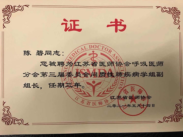 此前,10月29日,中國(guó)研究型醫(yī)院學(xué)會(huì)呼吸病學(xué)專業(yè)委員會(huì)間質(zhì)性肺疾病多學(xué)科診治專家委員會(huì)在上海成立。陳碧主任當(dāng)選中國(guó)研究型醫(yī)院學(xué)會(huì)間質(zhì)性肺疾病多學(xué)科診治專家委員會(huì)委員。