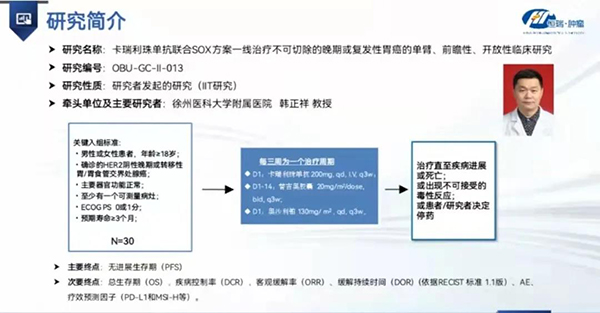 黃淮網(wǎng)  在2021年美國(guó)臨床腫瘤學(xué)會(huì)年會(huì)(ASCO)上,徐州醫(yī)科大學(xué)附屬醫(yī)院腫瘤科副主任韓正祥教授醫(yī)療團(tuán)隊(duì)牽頭的一項(xiàng)臨床研究——“卡瑞利珠單抗聯(lián)合SOX方案一線治療不可切除的晚期或復(fù)發(fā)性胃癌的單臂、前瞻性、開放性臨床研究”榮登大會(huì)。