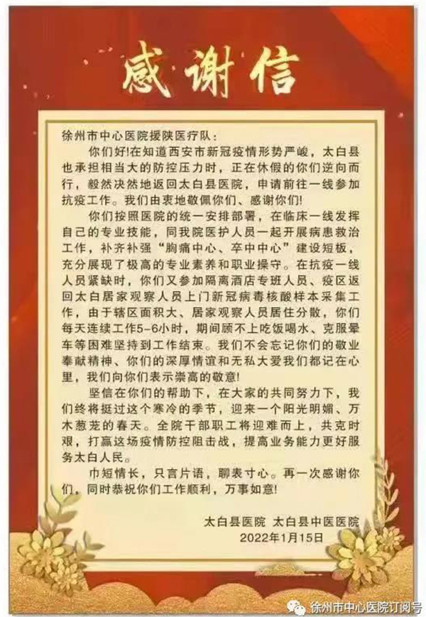 黃淮網(wǎng)(王斯琦) 近日,徐州市中心醫(yī)院收到一封來(lái)自陜西省太白縣醫(yī)院、太白縣中醫(yī)醫(yī)院的感謝信。