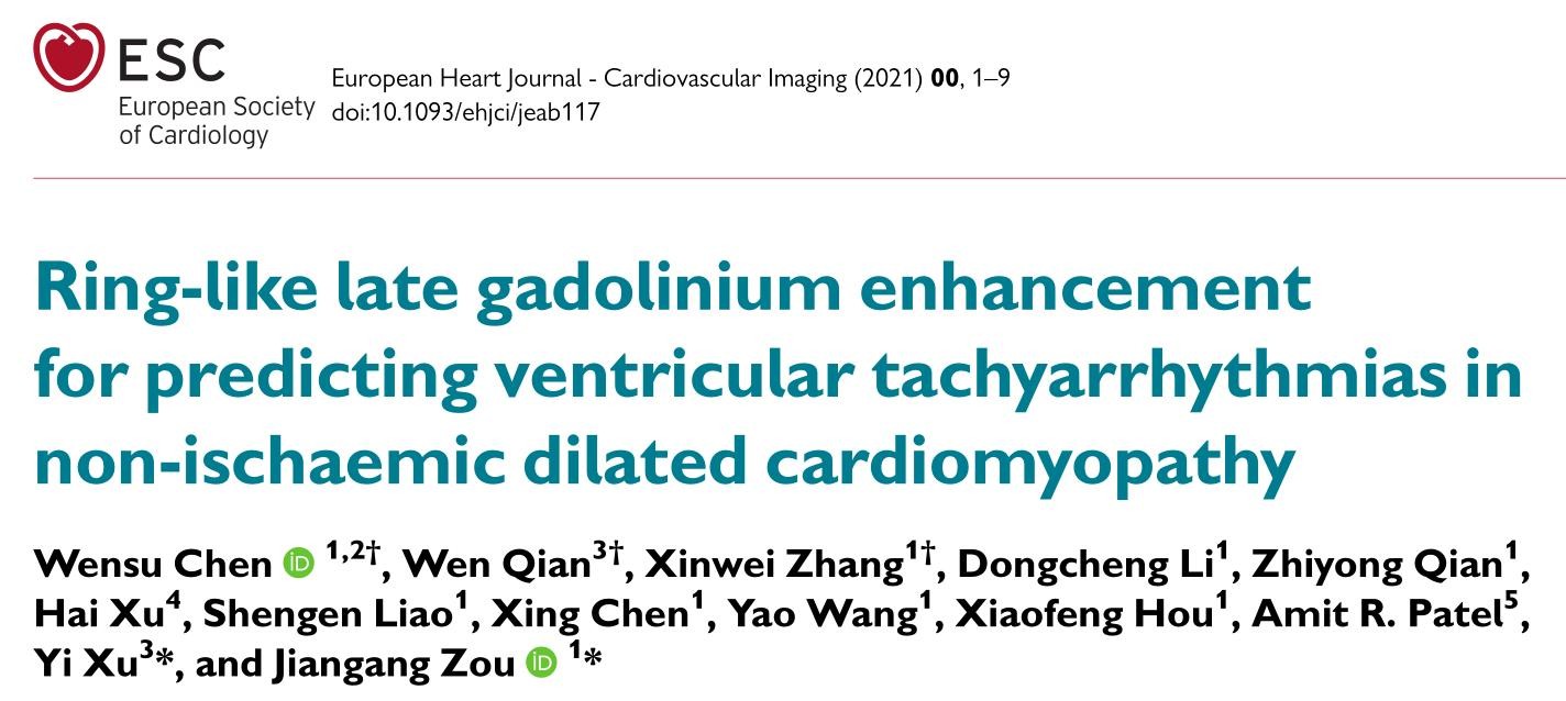 此外,陳文蘇博士另一研究成果“Ring-like late gadolinium enhancement for predicting ventricular tachyarrhythmias in non-ischaemic dilated cardiomyopathy”去年此時登上歐洲心臟病雜志子刊EHJ- Cardiovascular Imaging(中科院1區(qū))。此研究應(yīng)用心臟磁共振篩查出擴(kuò)張型心肌病高猝死風(fēng)險人群,為臨床猝死危險分層提供了重要評估依據(jù)。