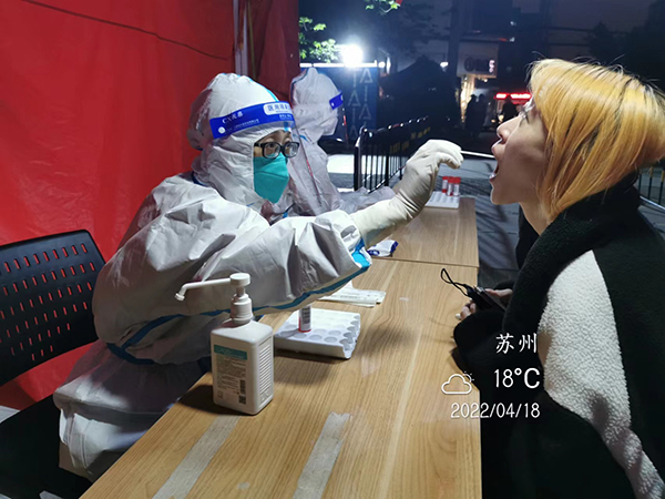 4月11日,相城;4月12日,太倉;4月13日,昆山;4月14日-18日,姑蘇;4月19日昆山;4月20日姑蘇……不知不覺,隊員們已經(jīng)在蘇州奮戰(zhàn)了10多天。他們克服各種困難,以高昂的斗志和飽滿的熱情投入工作任務(wù),體現(xiàn)了徐醫(yī)附院人的堅強意志,展示了徐醫(yī)附院人的過硬素質(zhì),得到了當(dāng)?shù)匦l(wèi)生主管部門和疫情防控指揮部的好評。
