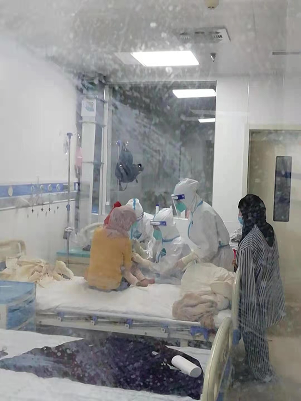 醫(yī)療隊中很多醫(yī)護人員雖然都是第一次直接接觸新冠患者,但熱血的醫(yī)護者不畏前方風(fēng)雨,不畏未知險路,甘愿擋在疫情前面,化為護佑生命的微光。穿脫防護服有許多細節(jié)需要注意,病區(qū)里也有很多規(guī)范需要遵守,大家都小心翼翼,絕不能出現(xiàn)任何疏漏。同時由于工作環(huán)境特殊,經(jīng)常到飯點兒不能下班,一些胃不好的同事出現(xiàn)了胃疼、胃脹癥狀。但是從始至終,沒有一個人想過退縮和放棄,在院領(lǐng)導(dǎo)、袁杰清隊長、康穎護士長的耐心指導(dǎo)和鼓舞下,大家都紛紛克服困難,迅速投入到抗擊疫情的戰(zhàn)斗,用努力和汗水把責(zé)任和奉獻完美演繹。召之即來、來之能戰(zhàn)、戰(zhàn)之能勝就是他們的生動寫照。