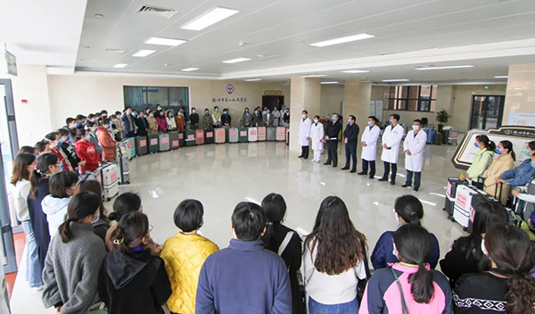 早上9點不到,隊伍已集合完畢,并在行政樓前舉行了簡短的出征儀式。黨委書記杜鐘祥,院長、黨委副書記丁繼存,副院長沈鵬等在場為隊員們加油鼓氣。杜鐘祥代表院黨委向隊員們表示感謝和敬意,要求大家大力發(fā)揚“人民至上、生命至上”的偉大抗疫精神,以高度的責(zé)任感、使命感認真做好救治工作。他叮囑大家要做好自我防護,確保自身安全。他表示,醫(yī)院將盡最大努力解決隊員家中的困難,請大家安心、放心工作!