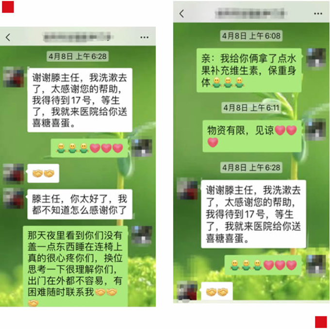 疫情期間,醫(yī)院實(shí)行閉環(huán)管理,門診部副主任滕俊萍也把家搬進(jìn)了醫(yī)院,24小時(shí)連軸轉(zhuǎn)早已成為她的工作常態(tài)。一天凌晨3點(diǎn)多,她在處理完一個(gè)急診問題后,發(fā)現(xiàn)門診大廳就診椅上躺著一對夫妻,雖然已是4月天,但深夜依然寒冷,夫妻倆蜷縮一團(tuán),和衣而睡,滕主任趕緊上前詢問。原來,這對夫妻來自外省市,在生殖助孕門診就診,進(jìn)入周期后恰逢疫情突發(fā),所以一直不敢離開醫(yī)院。后經(jīng)了解得知,像他們一樣的外埠患者還有十幾人。于是,一個(gè)叫做“在婦幼領(lǐng)被子”的微信群應(yīng)運(yùn)而生,生殖醫(yī)學(xué)科護(hù)士長李微登記需要留宿的人員數(shù)量,每天統(tǒng)一發(fā)放被子,定時(shí)回收消毒,如此堅(jiān)持了整個(gè)疫情時(shí)期。在這期間,滕主任購買了早飯、晚飯和水果送給他們,和患者一起扛過了這個(gè)艱難時(shí)刻。“在這個(gè)特殊時(shí)期,我們更要為患者考慮,盡一切辦法解決他們的困難,保障他們正常診療,這才是醫(yī)務(wù)工作者的價(jià)值。”滕俊萍如是說。