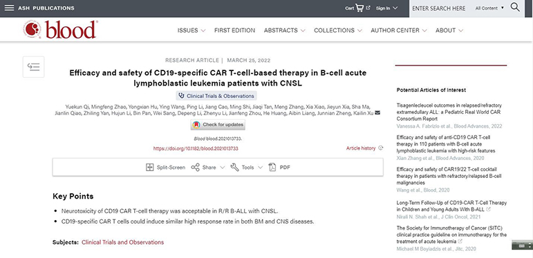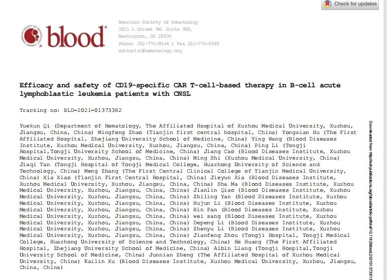黃淮網(wǎng) 日前,血液學(xué)頂級(jí)期刊《Blood》(IF 22.1)在線發(fā)表了徐州醫(yī)科大學(xué)附屬醫(yī)院血液科祁岳坤博士、王瑩博士(第一作者),徐開林教授(通訊作者)和徐州醫(yī)科大學(xué)腫瘤研究所鄭駿年教授(通訊作者)等完成的最新臨床試驗(yàn)結(jié)果:“Efficacy and safety of CD19-specific CAR T-cell-based therapy in B-cell acute lymphoblastic leukemia patients with CNSL”。