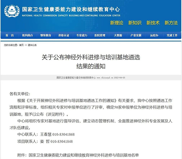 國家衛(wèi)生健康委能力建設和繼續(xù)教育中心面向全國優(yōu)質醫(yī)療機構遴選神經(jīng)外科進修與培訓基地。全國約200多家醫(yī)院報名參加。經(jīng)過初篩及材料上報的遴選,最終共有78家高水平醫(yī)院的神經(jīng)外科入圍最終答辯環(huán)節(jié)。通過國家衛(wèi)生健康委組織的權威專家對入圍答辯的參選單位?茖嵙、教學條件與制度等方面的綜合評審后,徐醫(yī)附院神經(jīng)外科在此次遴選中表現(xiàn)突出,成功獲批全國首批50家國家級神經(jīng)外科進修與培訓基地之一。全國僅有三家地市級醫(yī)院獲批。