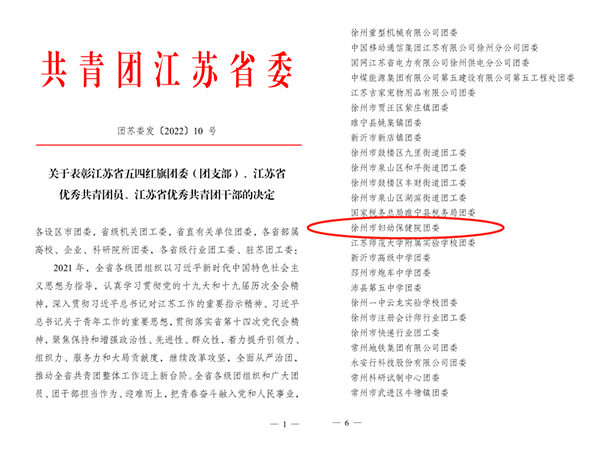 黃淮網(wǎng)(劉燦 姚萌) 近日,共青團江蘇省委發(fā)布《關(guān)于表彰江蘇省五四紅旗團委(團支部)、江蘇省優(yōu)秀共青團員、江蘇省優(yōu)秀共青團干部的決定》,授予265個團組織江蘇省五四紅旗團委(團工委)稱號,授予270個團組織江蘇省五四紅旗團支部(團總支)稱號,授予299名同志江蘇省優(yōu)秀共青團員稱號,授予290名同志江蘇省優(yōu)秀共青團干部稱號。徐州市婦幼保健院團委榮獲“江蘇省五四紅旗團委”稱號, 是此次全市衛(wèi)健系統(tǒng)唯一獲表彰的團委組織。
