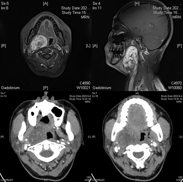 患者女性,47歲,因發(fā)現(xiàn)右頜下區(qū)腫物6年入住徐醫(yī)附院口腔頜面外科。入院后經(jīng)過(guò)頜面部增強(qiáng)CT和增強(qiáng)MRI檢查發(fā)現(xiàn)患者為右側(cè)口咽部腫物,腫物體積較大,上達(dá)顱底翼外肌水平,下至甲狀軟骨水平,致使半側(cè)咽腔堵塞。李家鋒主任憑借影像學(xué)資料及多年的臨床經(jīng)驗(yàn),初步考慮為神經(jīng)鞘瘤可能。但由于腫物體積較大,位于咽側(cè)深區(qū),毗鄰頸部重要大血管,致使該手術(shù)具有較大的難度和風(fēng)險(xiǎn)。既往對(duì)于該類型腫瘤,由于腫物體積較大,為避免重要血管及神經(jīng)損傷,術(shù)中需暫時(shí)劈開(kāi)下頜骨暴露腫物實(shí)施手術(shù)。術(shù)前和患者及其家屬溝通后,患者對(duì)下頜骨暫時(shí)劈開(kāi)心理負(fù)擔(dān)很大,希望盡可能避免下頜骨的劈開(kāi)。