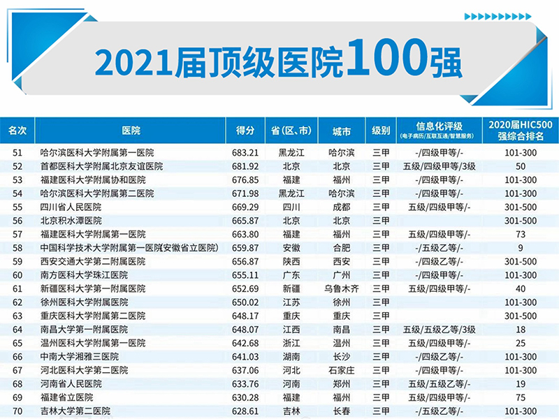 7月9日,艾力彼醫(yī)院管理研究中心發(fā)布《2021屆中國醫(yī)院競爭力排行榜》。徐州醫(yī)科大學(xué)附屬醫(yī)院蟬聯(lián)全國地級城市醫(yī)院500強(qiáng)排行榜第2位,位居全國頂級醫(yī)院100強(qiáng)排行榜第62位。同時發(fā)布了中國地級城市綜合醫(yī)院19個?频30強(qiáng)榜單,徐州醫(yī)科大學(xué)附屬醫(yī)院19個專科全部上榜,其中18個專科位居前5位、1個專科位居第6位。