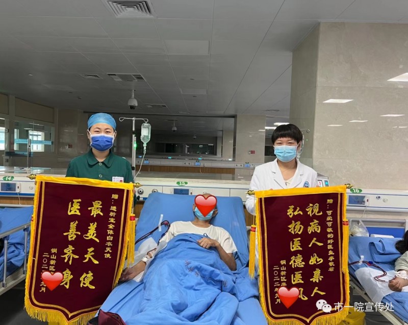 黃淮網(wǎng) 金秋九月,徐州市第一人民醫(yī)院的透析室里,上演著一幕幕溫馨情景。患者劉先生和李先生不約而同,先后把一面面書寫著他們心聲的錦旗送到了透析室醫(yī)護手里,并向他們表達了真摯的謝意和感激之情!