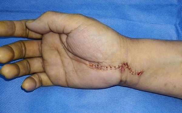 徐醫(yī)附院運動醫(yī)學團隊主任鄭偉副教授經(jīng)過仔細檢查,認為李阿姨的病情符合關節(jié)鏡下正中神經(jīng)松解的手術適應癥。經(jīng)過充分溝通,鄭偉主任和團隊成員做了術前仔細的計劃和周密的準備,在麻醉科、手術室的合作下,僅用20分鐘就完成了建立通道、鏡下松解正中神經(jīng)等主要操作步驟,手術只在手腕和手掌留了兩個6毫米的切口。術后第二天,李阿姨手指麻木感明顯減輕,手指的活動也輕松靈活了許多,李阿姨對手術效果非常滿意。