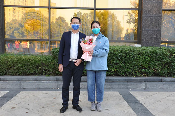 徐州市中醫(yī)院黨委書記范從海,黨委副書記、院長劉峰,黨委副書記、紀(jì)委書記陳勇,副院長張基棟,副院長馬傳衛(wèi)及相關(guān)職能部門負(fù)責(zé)人到現(xiàn)場迎接凱旋的抗疫戰(zhàn)士,為他們送上鮮花。