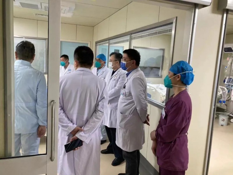▲ 沈鵬副院長(右三)醫(yī)務(wù)處孫萬軍處長(右二)到重癥醫(yī)學(xué)科詳細(xì)詢問重癥患者的救治情況