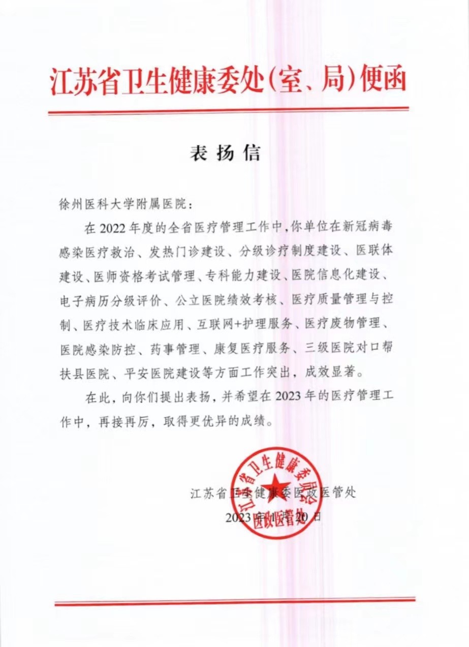 徐醫(yī)附院收到江蘇省衛(wèi)生健康委醫(yī)政醫(yī)管處表揚信