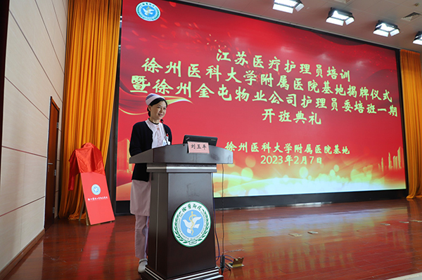 徐醫(yī)附院護(hù)理部主任劉玉平主持儀式并作為基地負(fù)責(zé)人作出承諾,表示將嚴(yán)格按照培訓(xùn)大綱開展培訓(xùn),在培訓(xùn)過程中不斷收集和反饋培訓(xùn)中的建議,探索適合護(hù)理員的培訓(xùn)模式。
