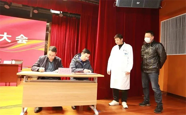 田浩院長分別與代表臨床科室、職能科室的大內(nèi)科主任陳思光、大外科主任賈鳳華、總務(wù)科科長杜勇簽訂2023年度科室目標(biāo)責(zé)任狀。
