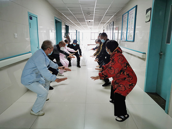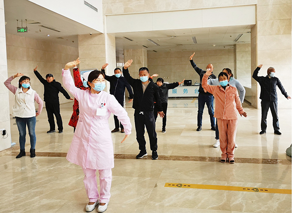 適當?shù)倪\動,可以改善腫瘤病人癌因性疲乏、抑郁、焦慮情緒,增加心肺功能,改善免疫系統(tǒng),提高生活質量。所以,放療科醫(yī)護人員帶領病人及家屬,每天晨間在病房學習八段錦,晚間在病房樓大廳指導鍛煉。此項活動獲得大家一致好評,給乏味的住院生活增添不一樣的色彩,越來越多的病人和家屬加入運動隊伍中。