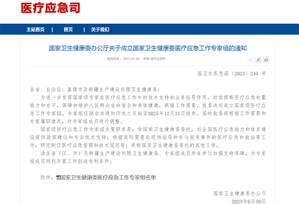 國(guó)家級(jí)醫(yī)療應(yīng)急工作專家組主要職責(zé)是:受國(guó)家衛(wèi)生健康委委托,對(duì)全國(guó)醫(yī)療應(yīng)急能力和體系建設(shè)提供政策建議和專業(yè)技術(shù)支持;根據(jù)實(shí)際需要赴現(xiàn)場(chǎng)指導(dǎo)和參與突發(fā)事件的醫(yī)療應(yīng)急和救治等工作;研究制訂醫(yī)療應(yīng)急管理和技術(shù)規(guī)范等;承擔(dān)國(guó)家衛(wèi)生健康委委托的其他工作。