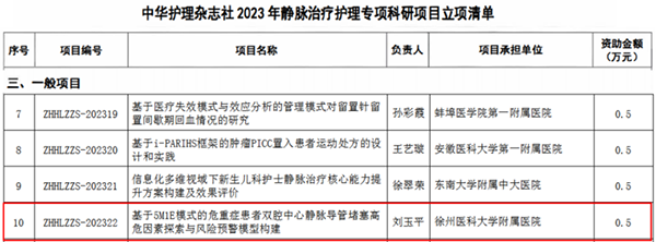 黃淮網(wǎng)(高晶)近期,中華護(hù)理雜志社發(fā)布了《2023年靜脈治療護(hù)理專項(xiàng)科研項(xiàng)目課題清單》的公告,徐州醫(yī)科大學(xué)附屬醫(yī)院申報(bào)的項(xiàng)目《基于5M1E模式的危重癥患者雙腔中心靜脈導(dǎo)管堵塞高危因素探索與風(fēng)險(xiǎn)預(yù)警模型構(gòu)建》成功獲批一般項(xiàng)目,實(shí)現(xiàn)該院在此類項(xiàng)目上的“零突破”。