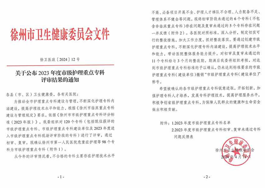 據(jù)悉,為不斷深化護(hù)理專(zhuān)科內(nèi)涵建設(shè),促進(jìn)護(hù)理技術(shù)水平和能力提高,徐州市衛(wèi)生健康委員會(huì)根據(jù)《徐州市臨床重點(diǎn)專(zhuān)科建設(shè)與管理規(guī)定》和《徐州市市級(jí)護(hù)理重點(diǎn)專(zhuān)科評(píng)分標(biāo)準(zhǔn)(2023年版)》,對(duì)全市申報(bào)的120個(gè)專(zhuān)科進(jìn)行了嚴(yán)格的評(píng)審。經(jīng)過(guò)初審和復(fù)審,最終確認(rèn)了98個(gè)專(zhuān)科為市級(jí)護(hù)理重點(diǎn)專(zhuān)科。徐醫(yī)附院申報(bào)的18個(gè)專(zhuān)科全部通過(guò)認(rèn)定,涵蓋了呼吸與危重癥科護(hù)理、胸心外科護(hù)理、普外科護(hù)理、急診急救護(hù)理、危重癥護(hù)理、血液內(nèi)科護(hù)理、手術(shù)室護(hù)理、神經(jīng)內(nèi)科護(hù)理、血液凈化護(hù)理、骨科護(hù)理、神經(jīng)外科護(hù)理、腫瘤科護(hù)理、泌尿外科護(hù)理、兒科護(hù)理、放射治療護(hù)理、介入科護(hù)理、麻醉科護(hù)理、產(chǎn)科護(hù)理。