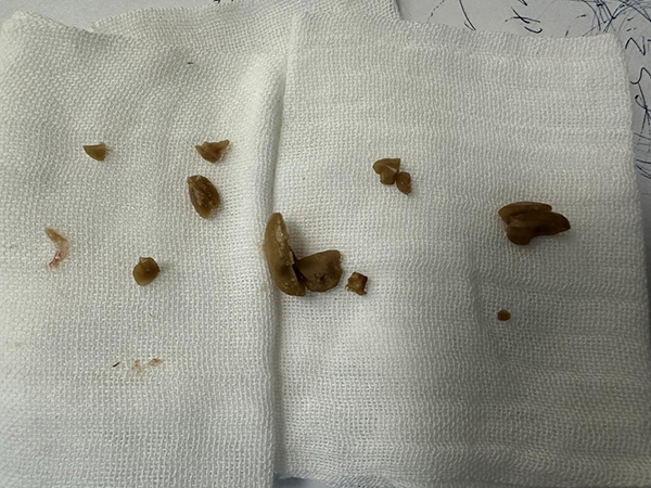 季磊副主任醫(yī)師在楊翌、蔣宇及劉慧醫(yī)師的協(xié)助下,在全麻下經(jīng)氣管插管(8#)套管進鏡,左主支氣管內(nèi)可見被粘痰、壞死物包裹一圓形異物,清理后發(fā)現(xiàn)異物為花生粒,長徑約2cm,由于花生粒過大,無法通過8#氣管導管,于是將花生粒分解,通過使用圈套器、異物鉗以及網(wǎng)籃逐一將其取出,總共歷時1.5個小時。取出異物后,左主支氣管及其分支可見大量黃色膿性分泌物,予以充分吸除。